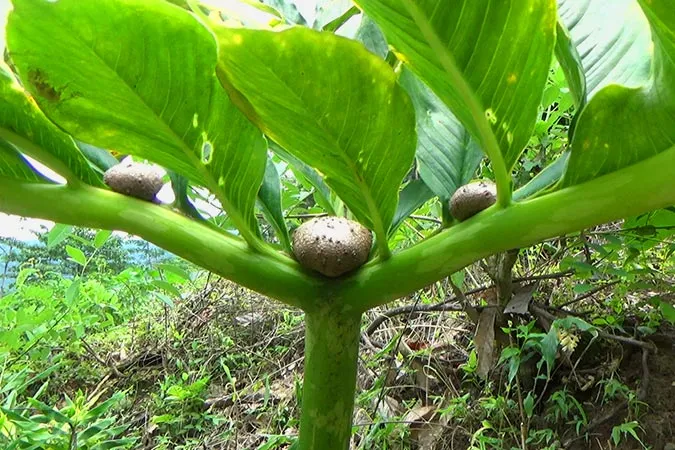 Porang has vegetative organs consisting of leaves, stems, tubers and roots. The pseudo-stem grows for 6 months, then falls off and the tubers that have formed enter dormancy. The tubers will grow into new plants in the following rainy season. When the tuber is big it will grow flowers.
