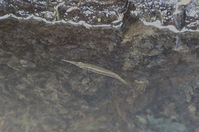 Julung or wrestling halfbeak or silver halfbeak (Dermogenys pusilla) is a species of animal in Zenarchopteridae, small fish, slender, very long mandible, silver or golden or reddish color, live in fresh water, rivers and ditches that have fast currents.