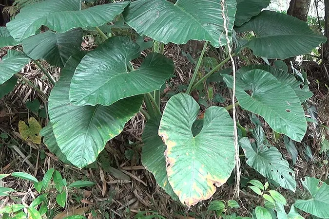 Leaves, stems and tubers are used as animal feed and carp. Shield-shaped and wide leaves are often used as head protection when it rains, food wrappers and live fish containers.